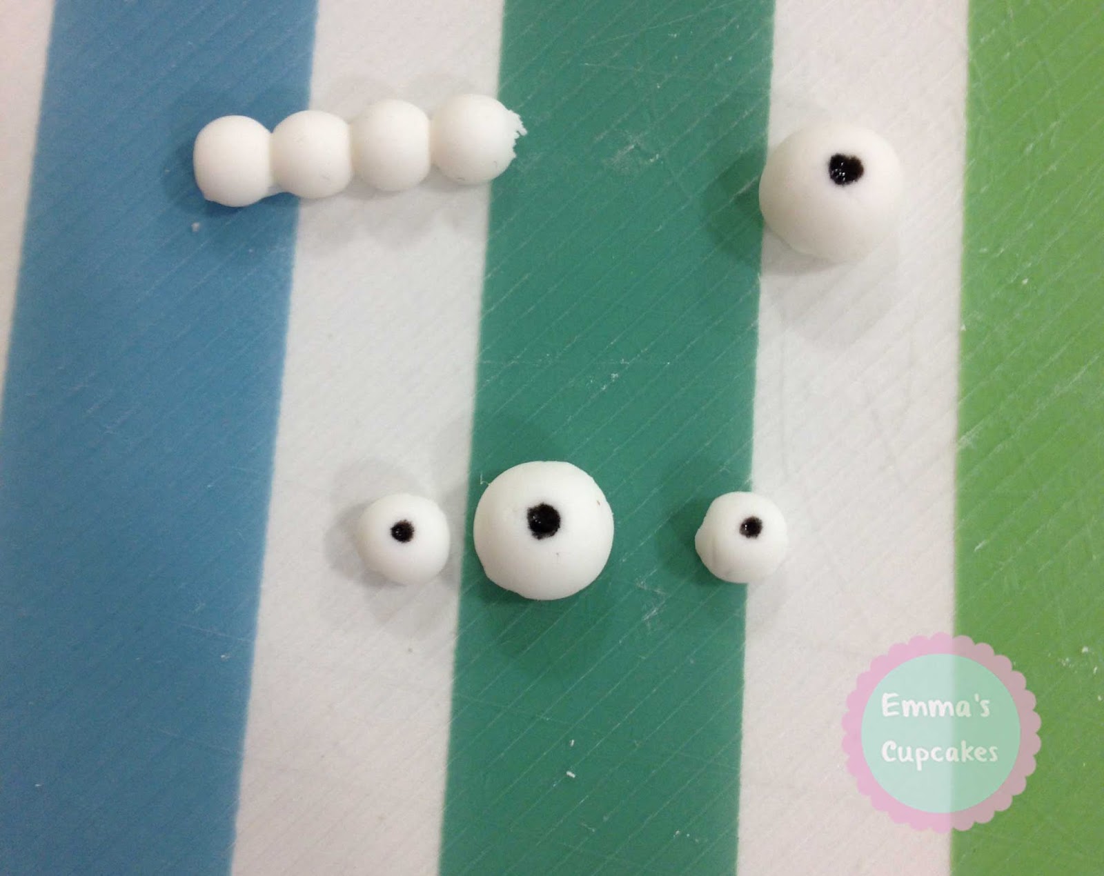 Una vez tengamos el pelo hecho, vamos a hacer los ojos y la boca de nuestros monstruos. Para ello necesitaremos fondant blanco y negro, un rodillo pequeño, rotulador negro comestible y un molde de perlas.
